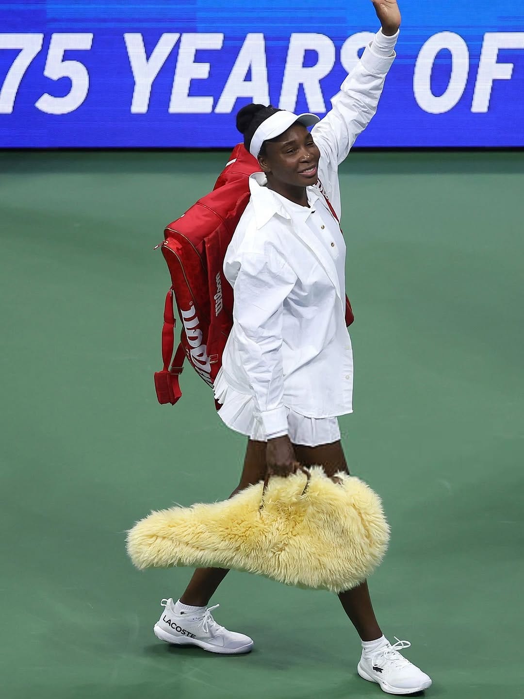 For her first round singles match, she partnered with the hip California brand ERL on a white polo and pleated skirt set inspired by Althea Gibson, one of the first Black players to cross the color line of international tennis 75 years ago, and who the US Open is honoring this year. The inspiration alone made it interesting, but it was also topped off with a quirky accessory: a seriously fuzzy yellow shearling racquet bag.