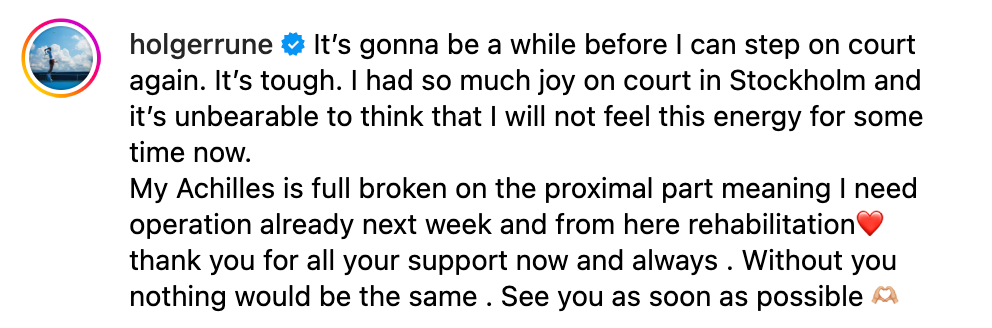This weekend Holger Rune tore his achilles heel while playing in the semi-finals in Stockholm against Ugo Humbert. Up a set and on serve in the second, it happened unexpectedly during a rally—almost out of nowhere, Rune could barely walk and hobbled over to his bench where he burst into tears. My husband, the athlete whisperer, called it right away that is was an achilles issue and unfortunately he was correct. On Instagram this morning, Rune posted: