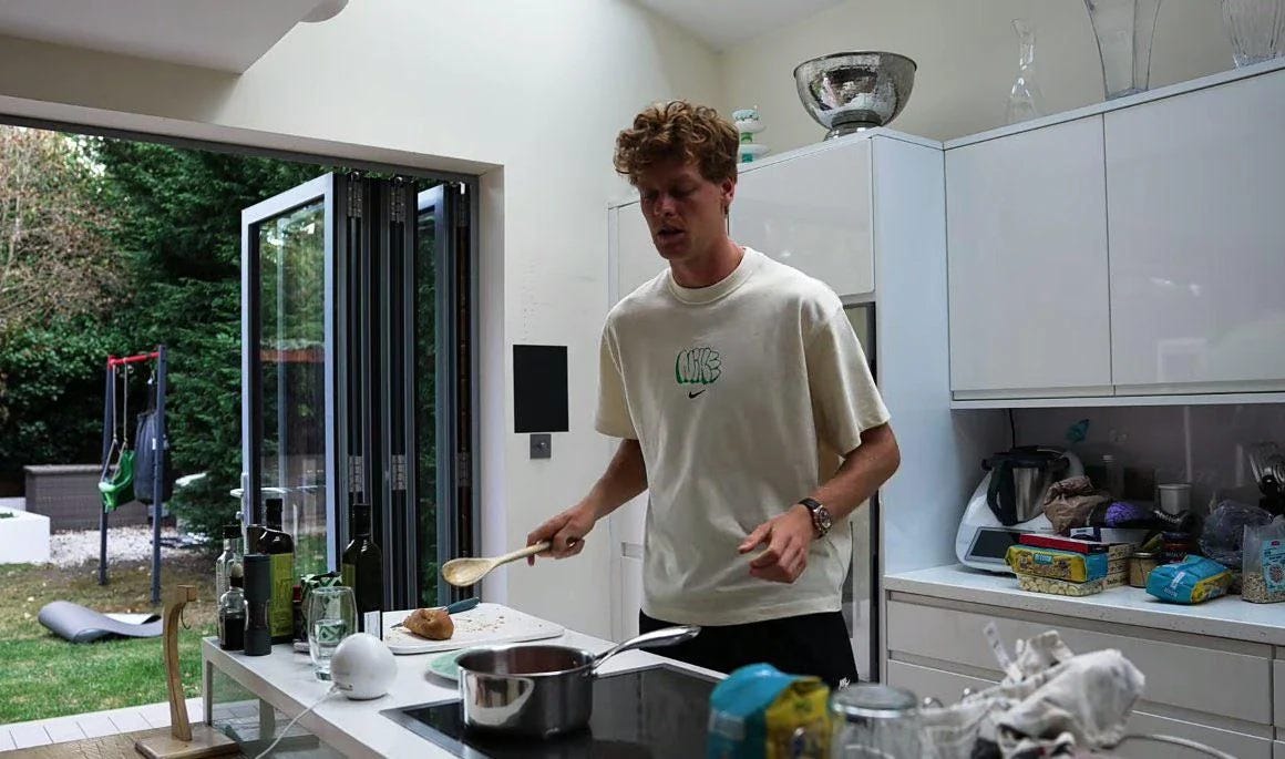 The WAGs are right there with me, blabbing (at an almost imperceptible volume) while I cook dinner. As one YouTuber pointed out, "Jannik is so good he says '6 days until finals' instead of 'Round of 16.' Bro knows he's going to win 😂." King behavior